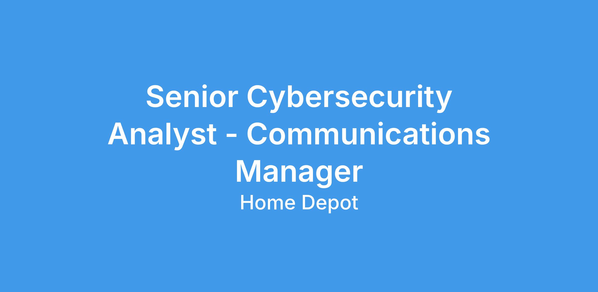 This is a Communications Manager role within our Cyber Security organization. Protecting what matters most to our associates and consumers by securing our sensitive data and critical assets from current and emerging threats. At The Home Depot Cybersecurity consists of Architecture, Governance, Identity & Access Management, Internal Threat Operations, Issue and Compliance Management, Risk Assessment/Advisory, Security Consulting, Security Operations and Strategic Planning.